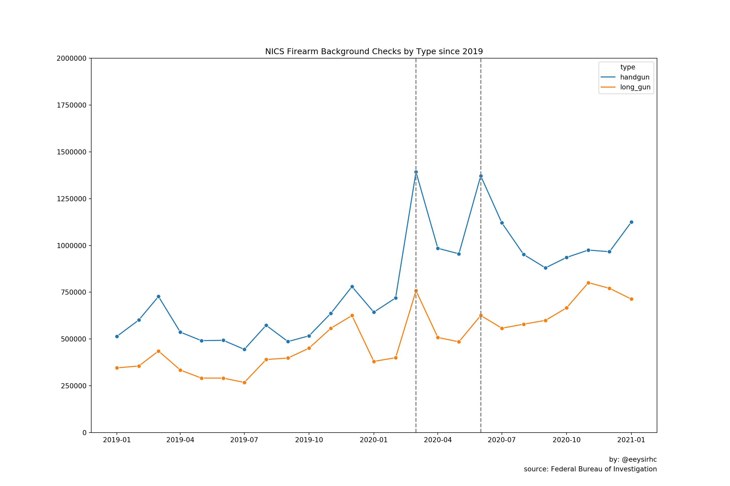 The plot above highlights two major spikes in firearm sales - especially for handguns.