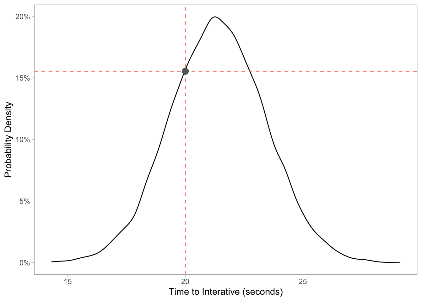 For Target, we can use it to answer the question: what is the probability we will measure a time_to_interactive page speed score of exactly 20s?
