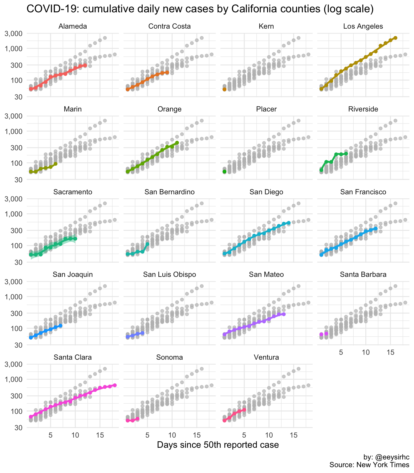 labs(title = "COVID-19: cumulative daily new cases by California counties (log scale)",